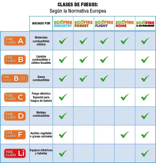ECOFIRE puede apagar diferentes tipos de incendios (clases A, B, C, D y F), actuando sobre materiales sólidos, líquidos inflamables, equipos eléctricos o grasas combustibles. Su acción rápida y potente lo hace entre 30 y 40 veces más eficaz que el agua tradicional.